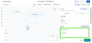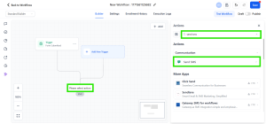 Pada workflow, klik Please Select Action, lalu pada kolom pencarian di sisi kanan ketik SMS. Setelah itu, pilih dan tambahkan action Send SMS.