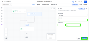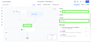 Pada workflow, klik kembali tombol Please Select Action yang berada di atas action SMS. Kemudian, pada kolom pencarian di sisi kanan ketik Drip, lalu pilih dan tambahkan action Drip ke dalam workflow.