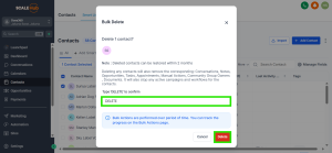 Menghapus kontak juga akan menghapus: Percakapan, Catatan, Peluang, Tugas, Janji Temu, Tindakan Manual, dan Kepemilikan Grup Komunitas. Hal ini juga akan menghentikan semua kampanye dan workflow aktif untuk kontak tersebut. Kontak yang dihapus dapat dipulihkan dalam waktu 2 bulan.